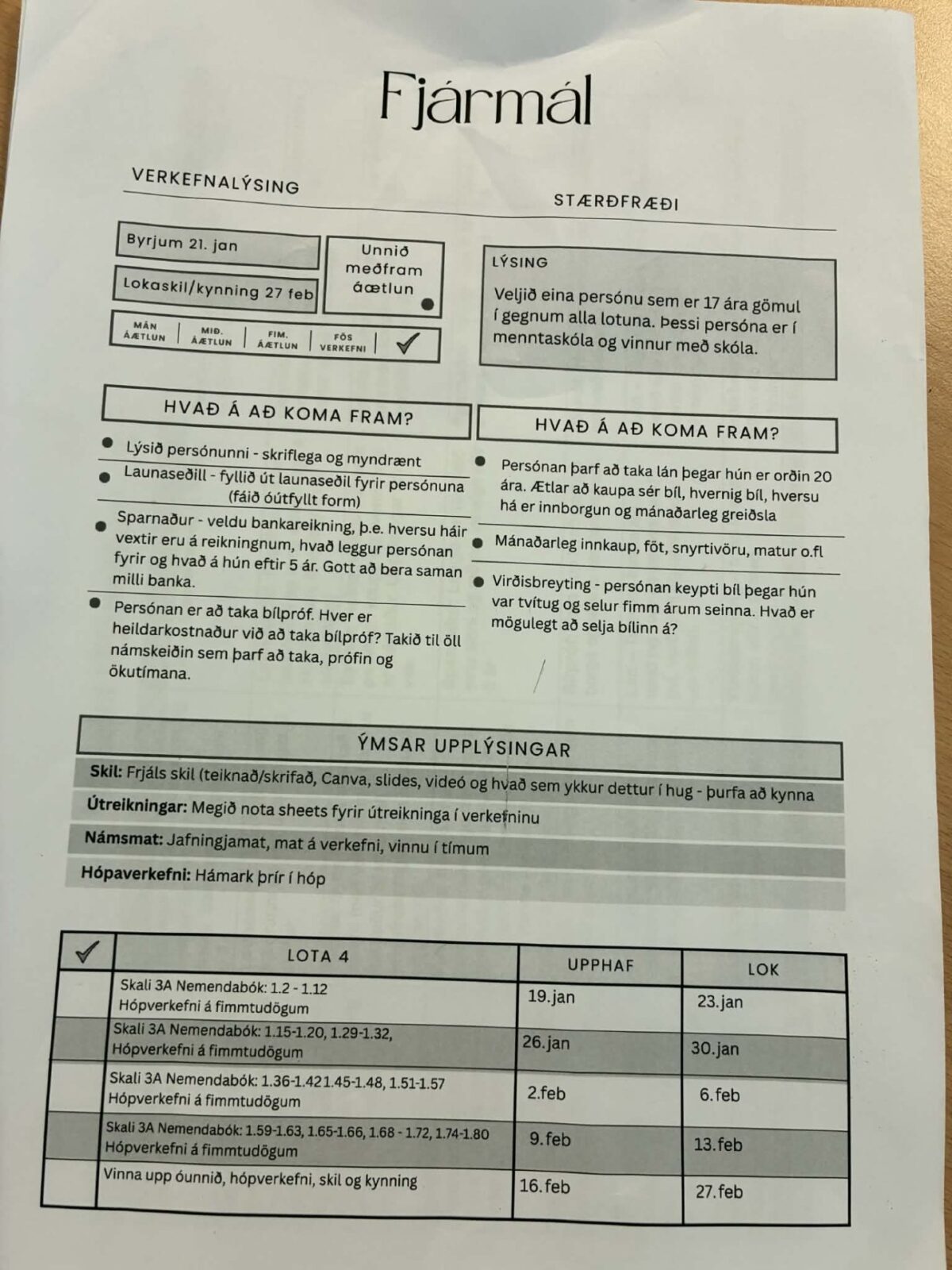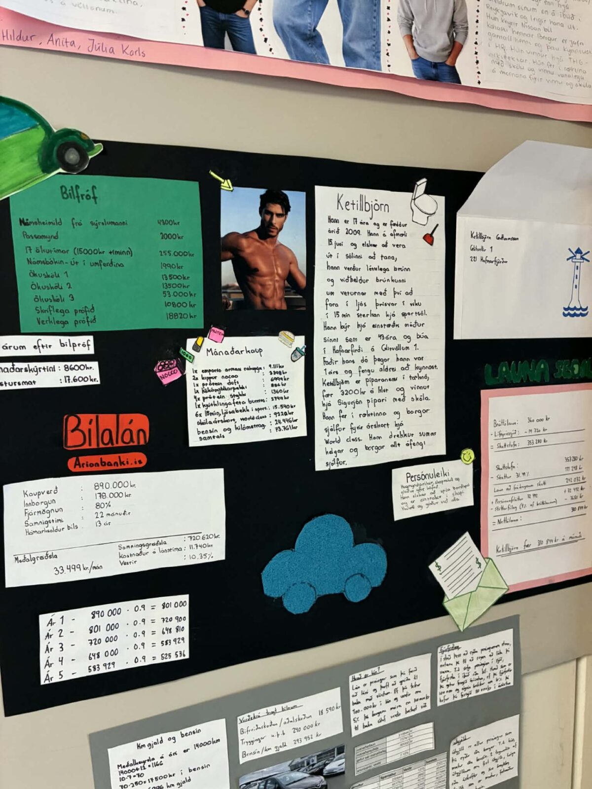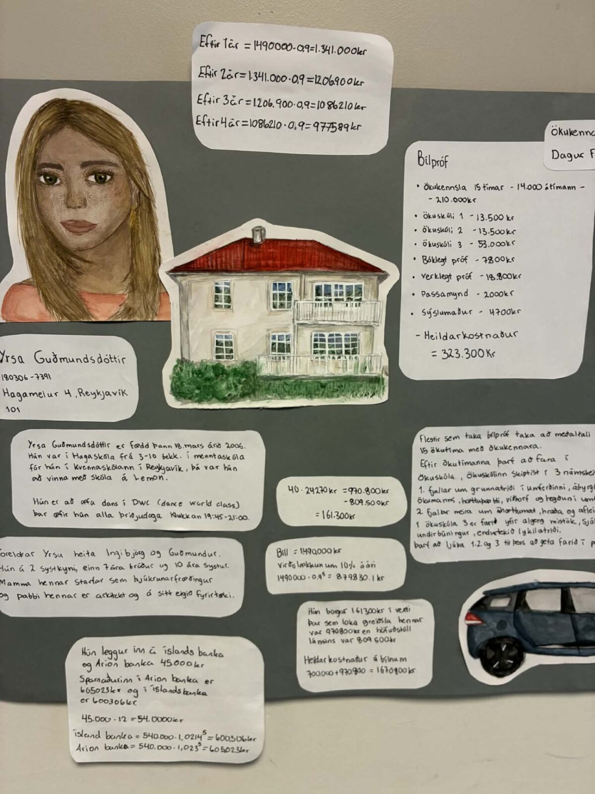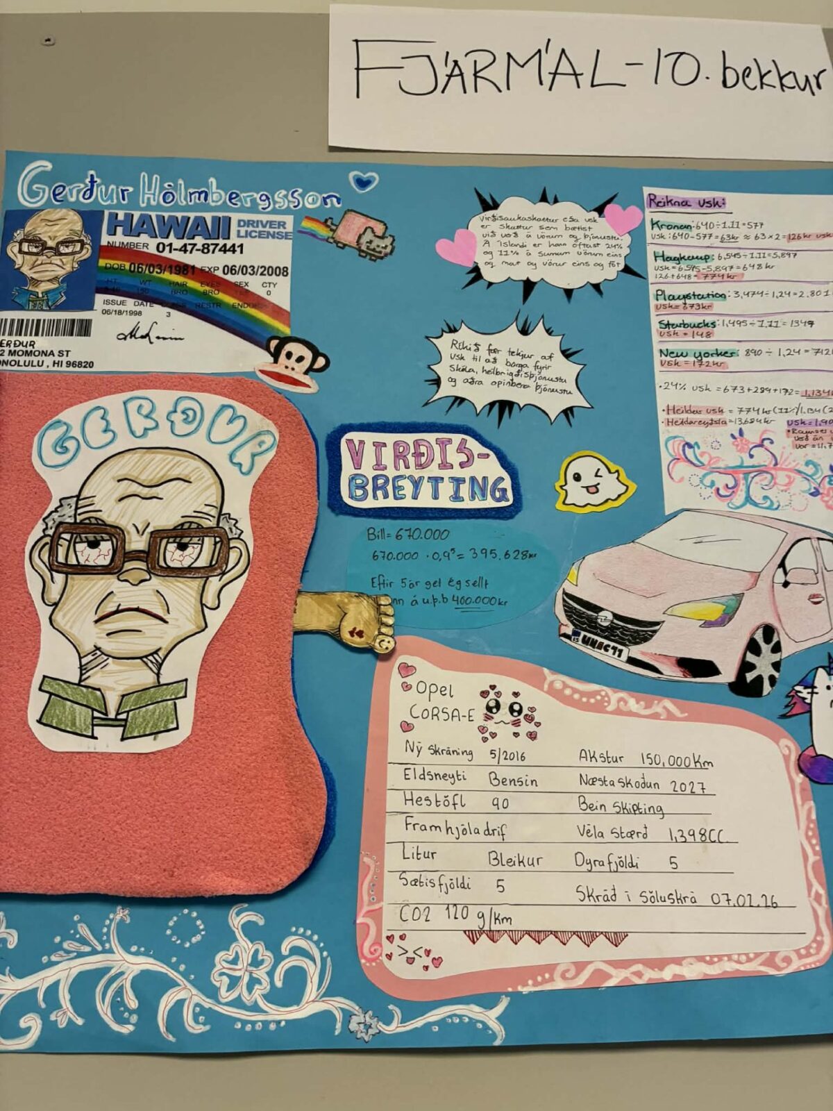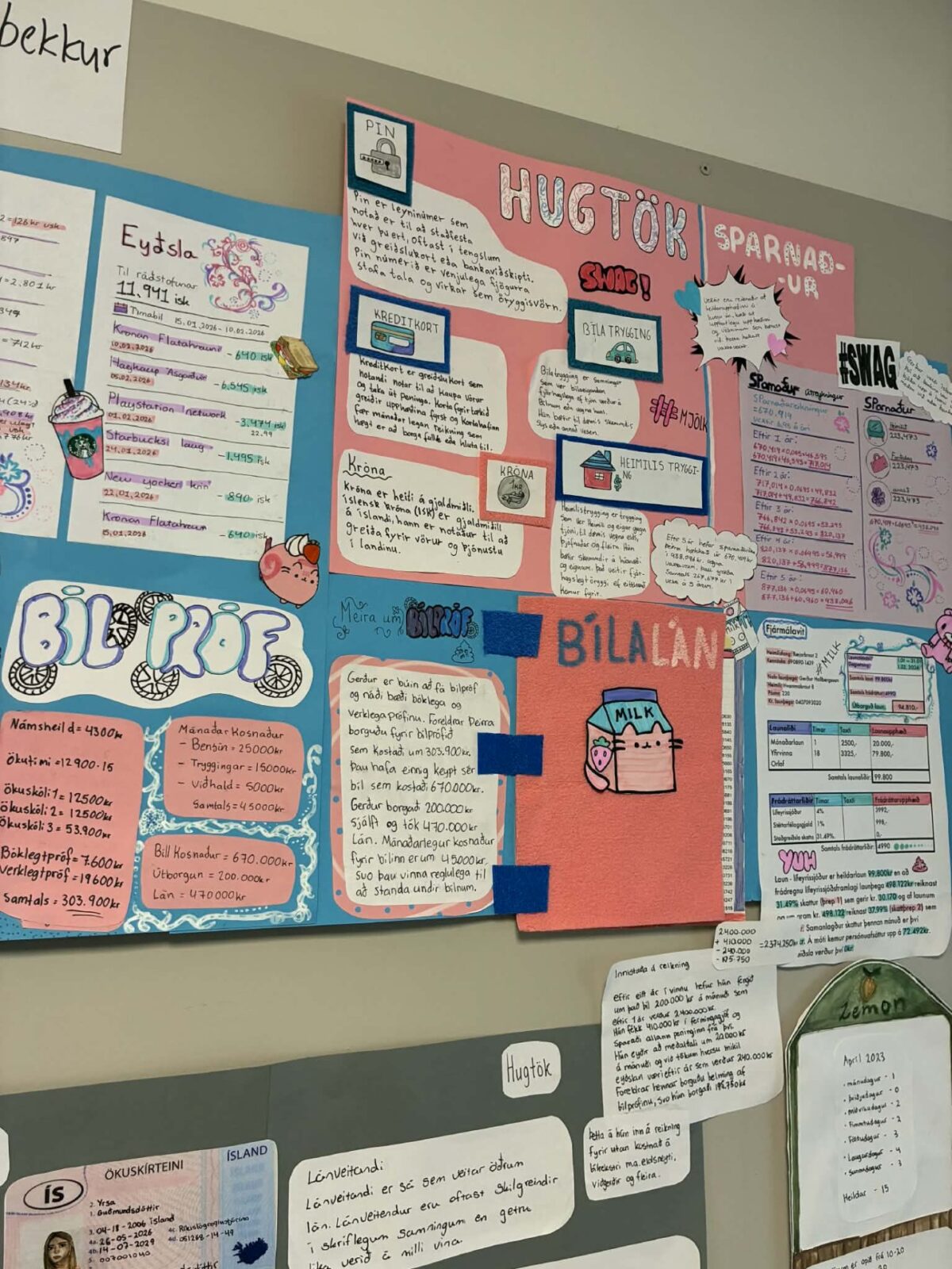 Krakkarnir í 10. bekk unnu áhugvert verkefni í fjármælalæsi um daginn. Þau áttu að ímynda sér sig sem 17 ára ungling sem væri að taka bílpróf, taka bílalán um tvítugt, skoða eyðslu og vsk, hvernig væri best að spara pening og hve t.d. mikið bíll breytir um virði fimm ár eftir kaup. Þau fengu að velja hvernig þau vildu skila en flest völdu að gera plakat, nota Canva eða slides. Útreikningum var skilað á sheets. Deila Tísta