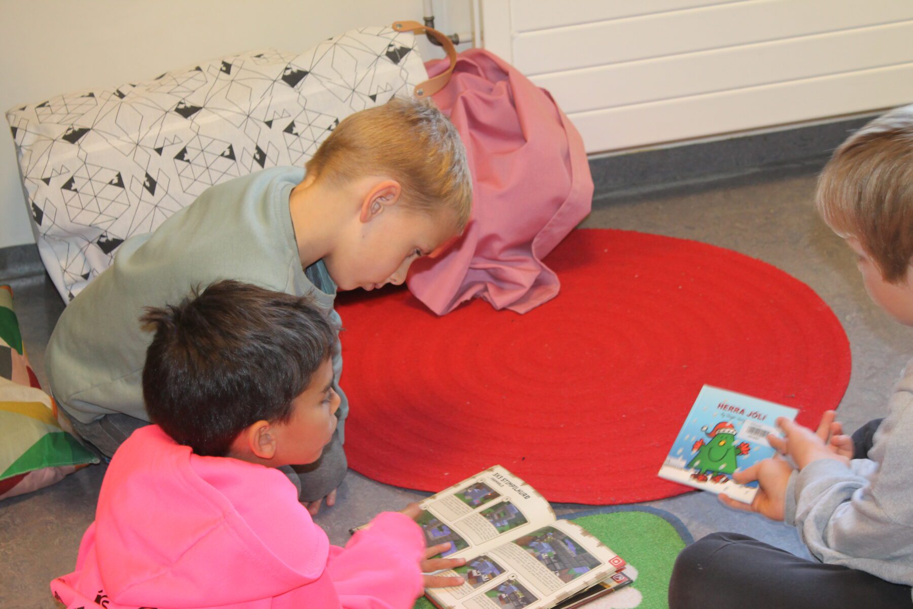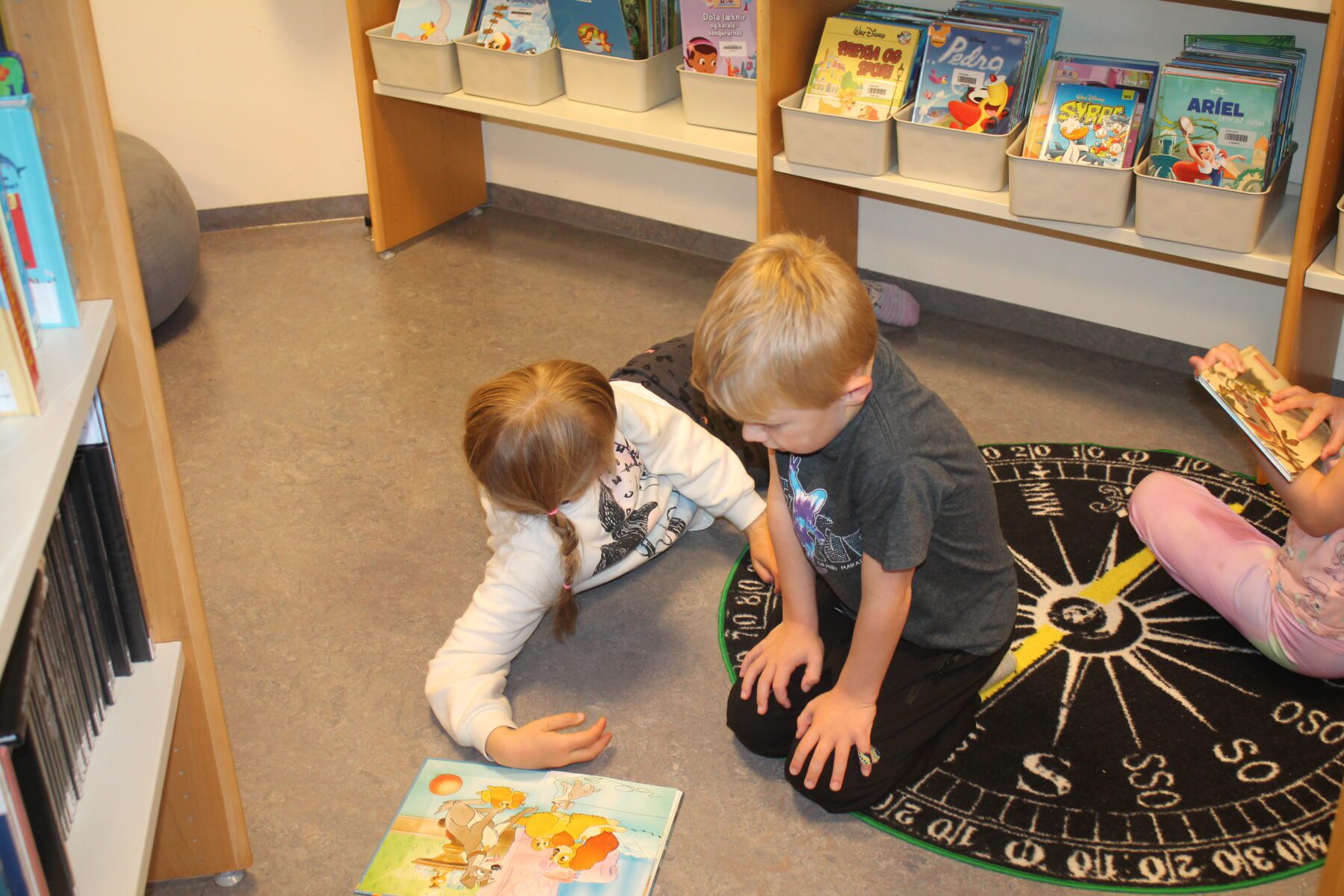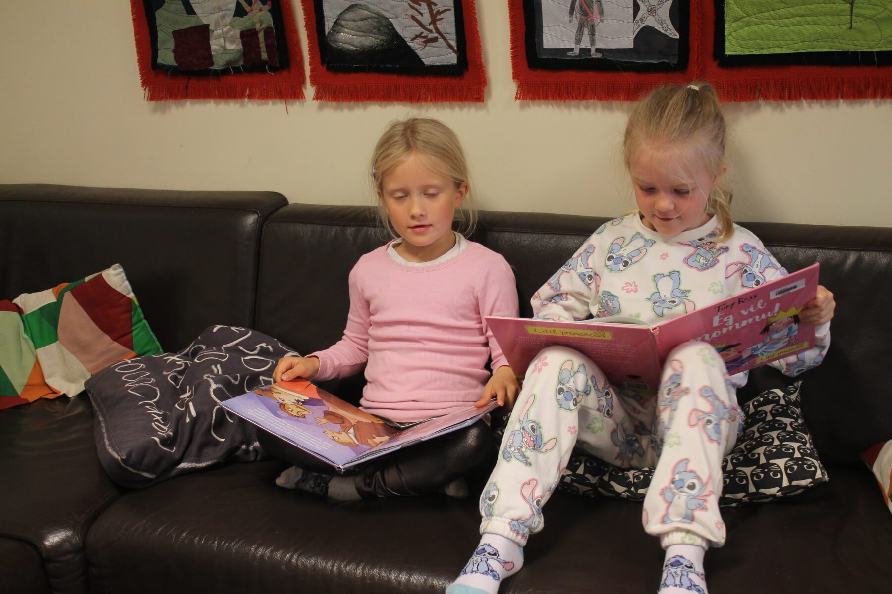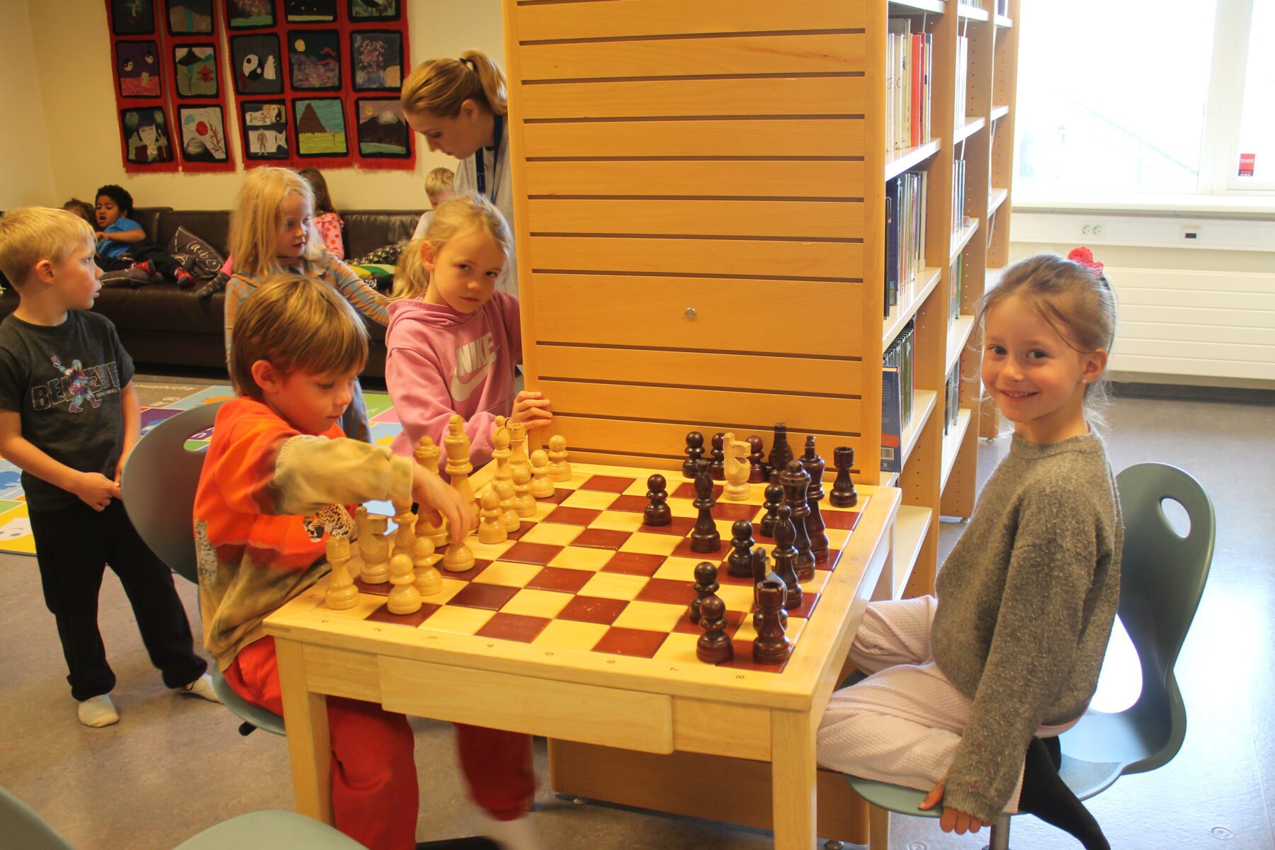 Krakkarnir í 1. og 2. bekk koma einu sinni í viku í sögustund til Þóru á bókasafninu. Hún les fyrir þau sögu og svo fá þau smá tíma til að setjast niður að kíkja í bækur og jafnvel taka eina skák. Deila Tísta