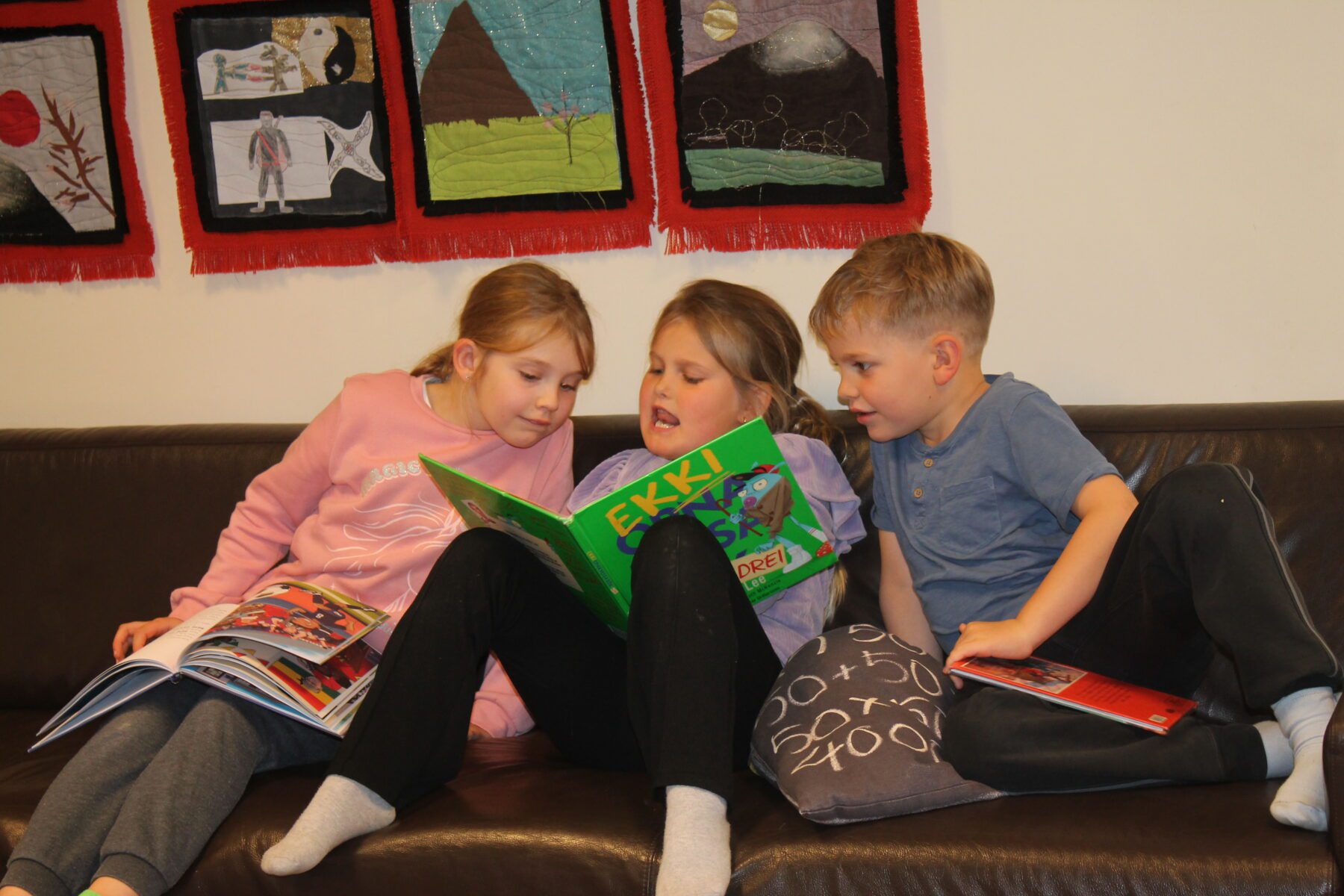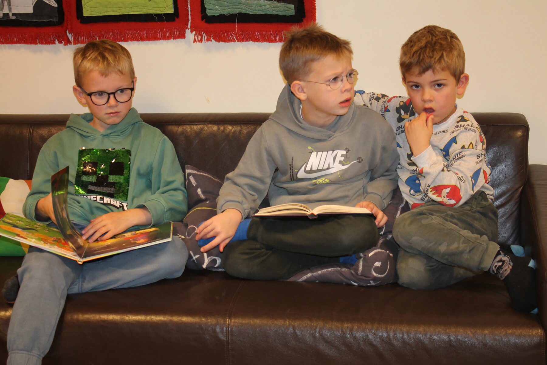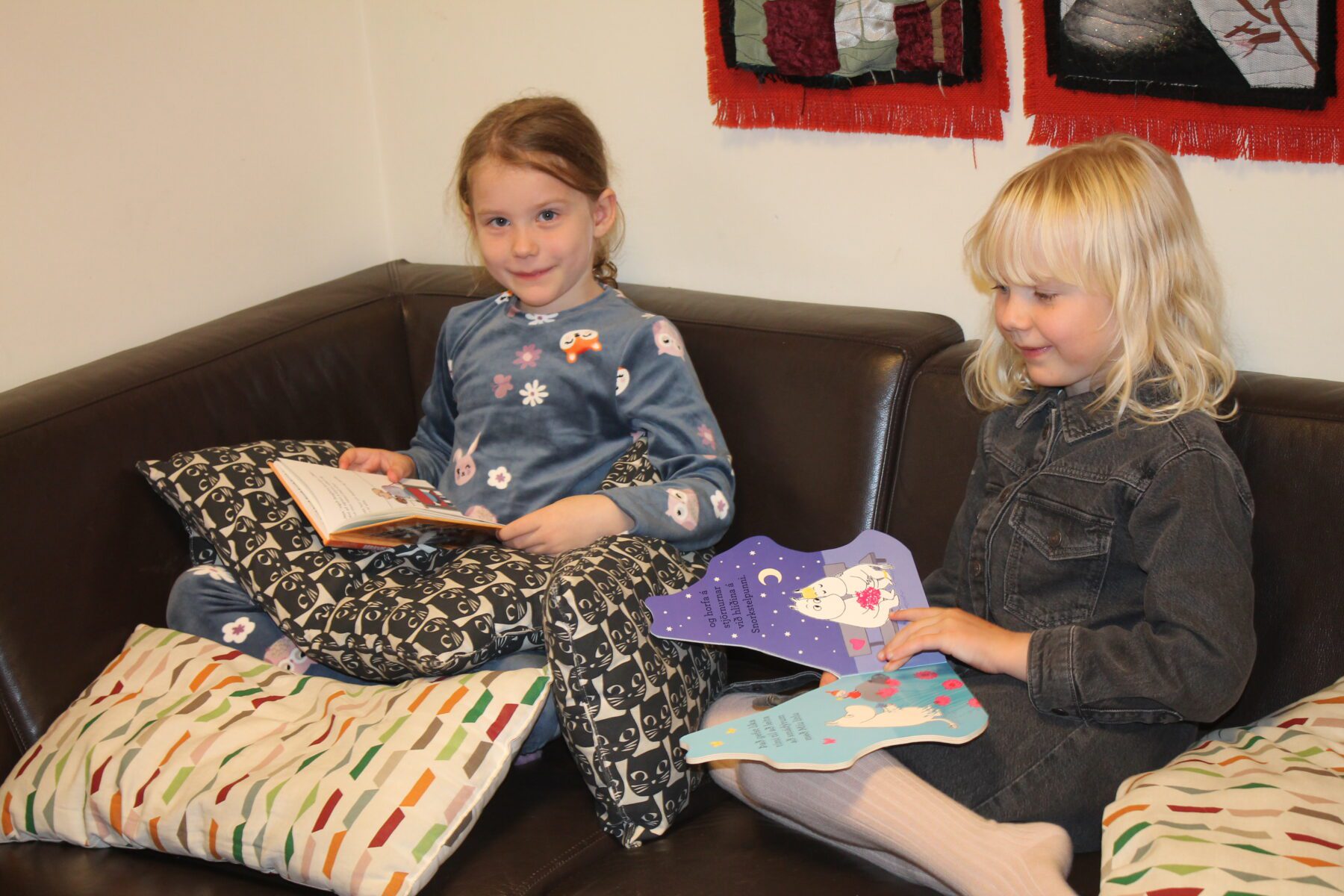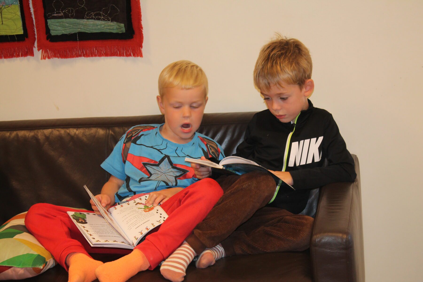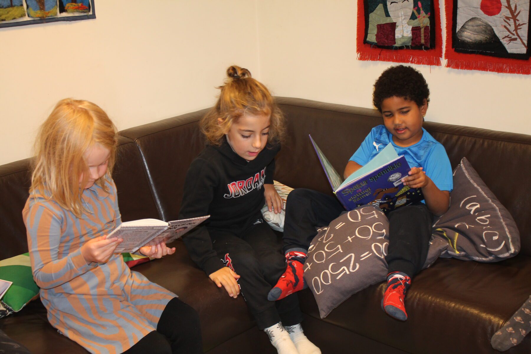 Krakkarnir í 1. og 2. bekk koma einu sinni í viku í sögustund til Þóru á bókasafninu. Hún les fyrir þau sögu og svo fá þau smá tíma til að setjast niður að kíkja í bækur og jafnvel taka eina skák. Deila Tísta