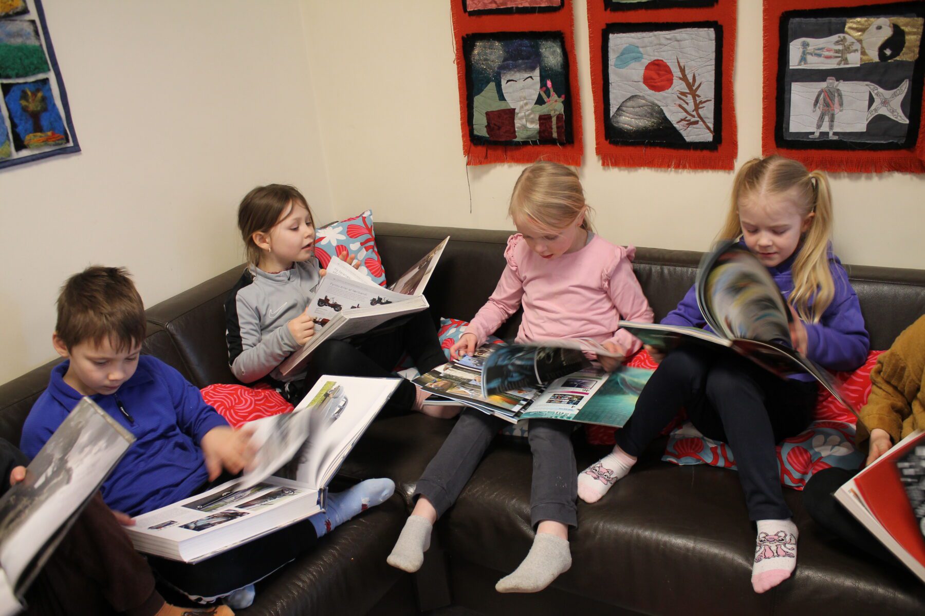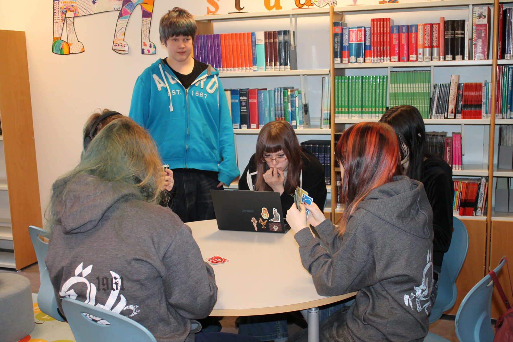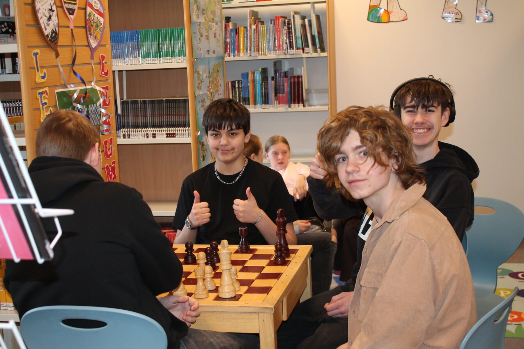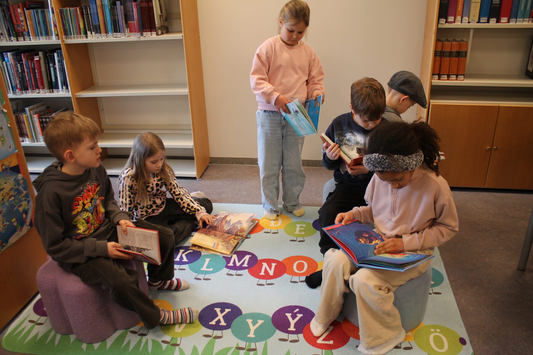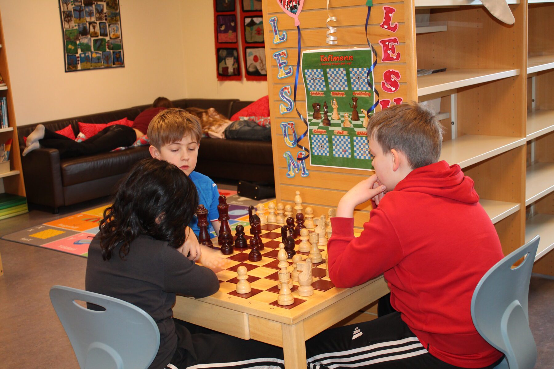 Það er búið að vera líf og fjör á bókasafninu í þessari viku. Krakkar í 2. bekk að kíkja í bækur eftir sögustund, unglingar í frímínútum að tefla, læra, spila og slappa af í sófanum og krakkar í 1. bekk að kynna sér fræðibækur. Deila Tísta