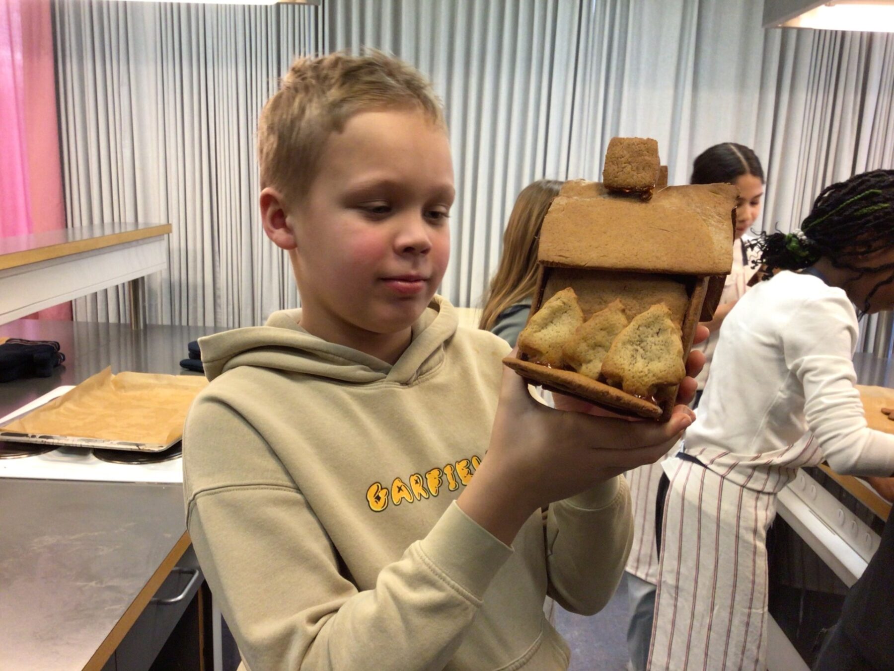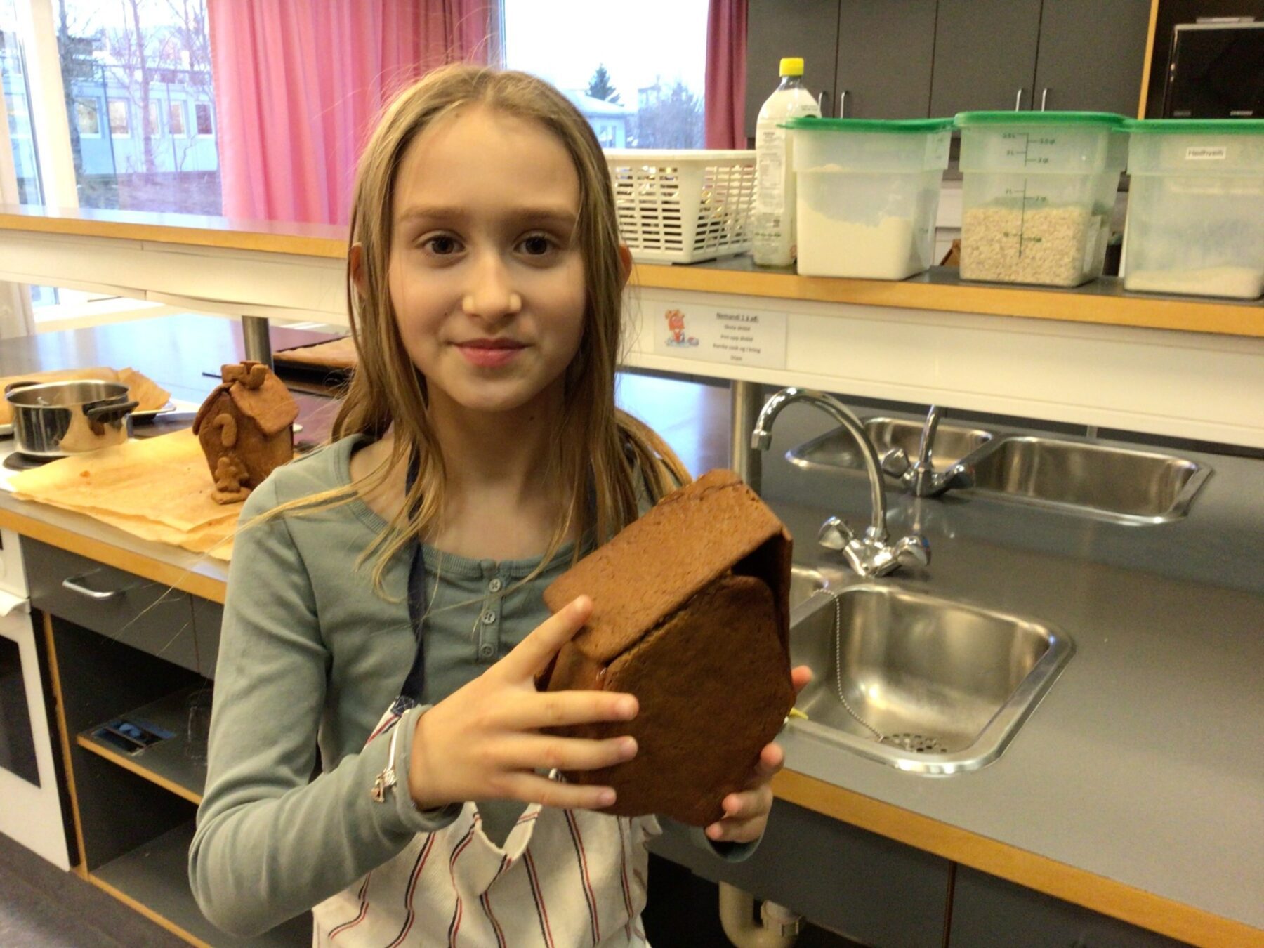 Alltaf gaman í heimilisfræði. Krakkarnir í 5. bekk bökuðu flott piparkökuhús. Strákahópur í 9. bekk gerðu flottar myndakökur. Þeir völdu mynd sem þeir drógu í gegn á smjörpappír med lituðu svamp botns deigi. “Lituðu” restina af myndinni með viðeigandi litum. Kældu aðeins og settu svo afganginn af ólitaða deginu yfir og bökuðu í 15 mín. Deila Tísta